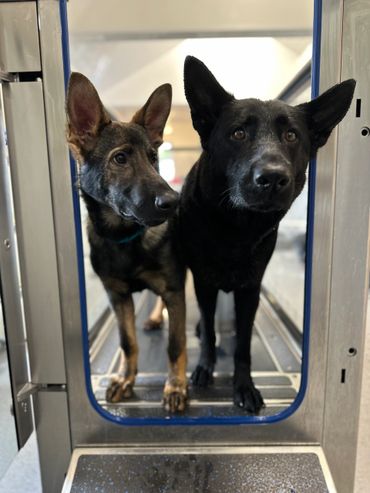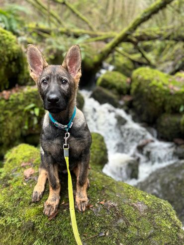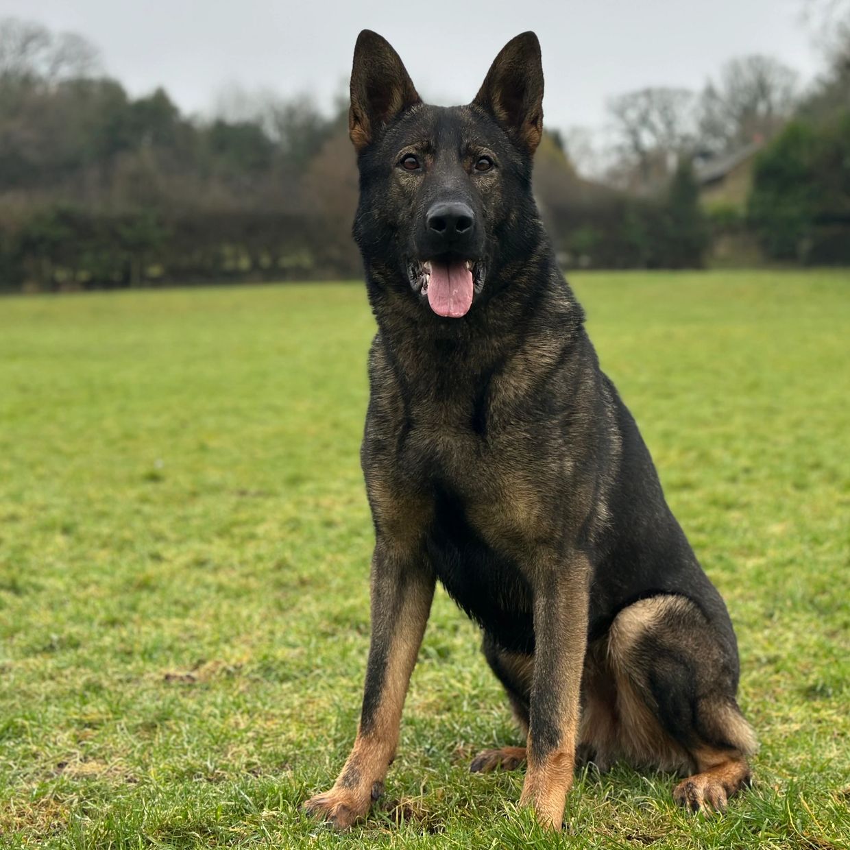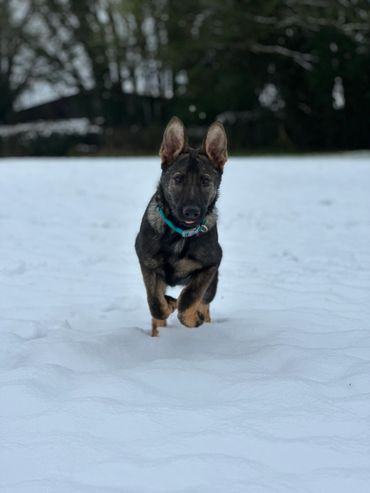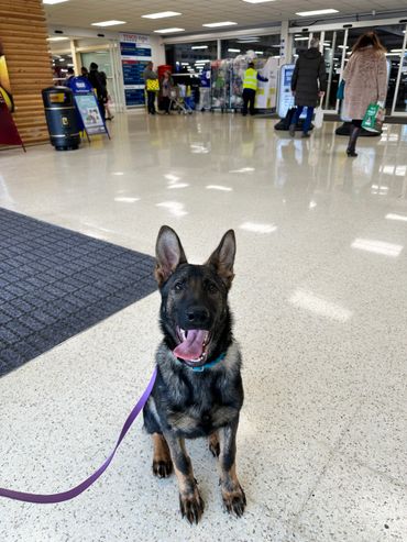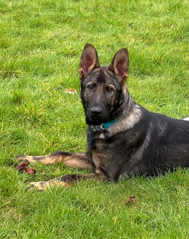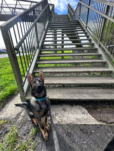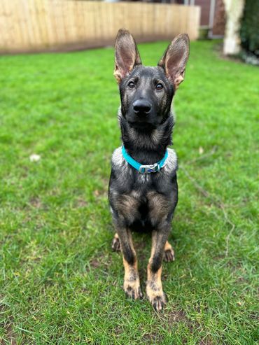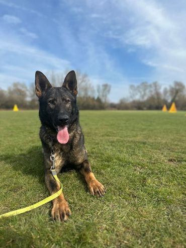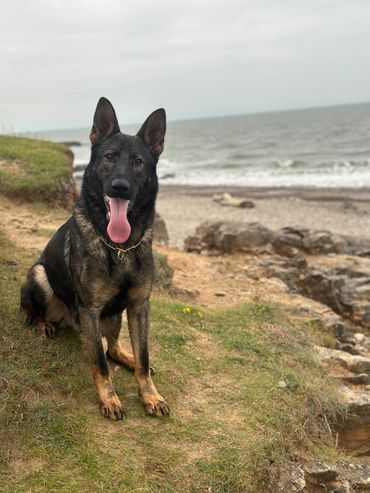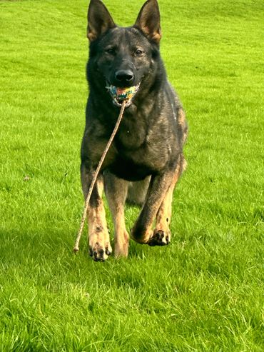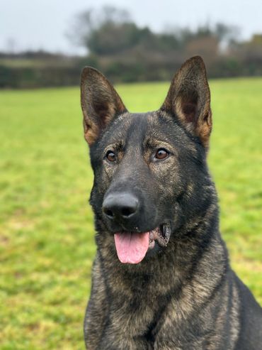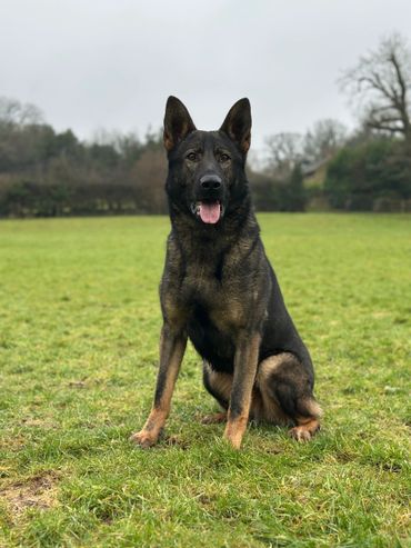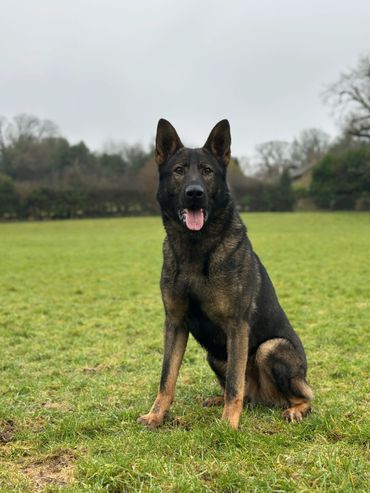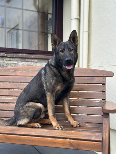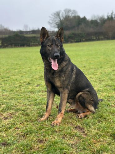Maverick is a strong looking but athletically built male German Shepherd who stands at 63cm at the wither and weighs around 38kg.